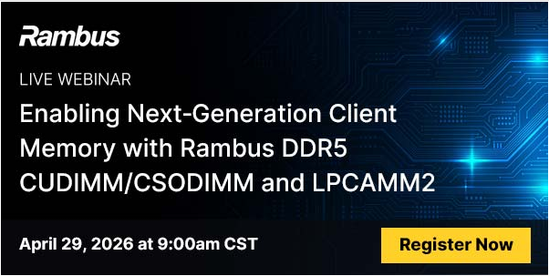 As client platforms push toward higher performance, greater efficiency, and AI ready computing, memory subsystem design has become a critical differentiator for next generation systems. In this upcoming webinar, Rambus experts will explore how complete client memory interface chipsets enable high performance DDR5 CUDIMM and CSODIMM modules operating up to 7200 MT/s, including support for overclocking.